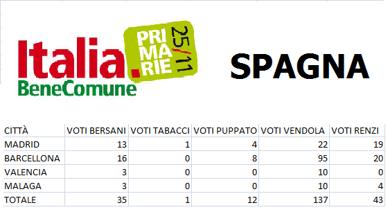 Le primarie a Barcellona, invece sì. Almeno per me. Sarà che qui SEL ha un comitato bello forte, e che Vendola stesso, d’altronde, ha partecipato a una tavola rotonda coi Verdi catalani un anno fa. Ma, almeno per una fetta d’italiani a Barcellona, parlano più questi risultati che svariati trattati di sociologia.