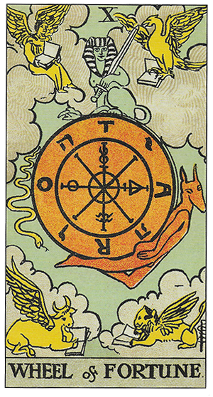 Riprovo con la croce a cinque carte (livello avanzato!), e quando chiedo di Bruno… Ecco di nuovo La Ruota della Fortuna: la sua posizione nella tirata indica il passato. Che minchia vuol dire? Sfoglio il libretto delle istruzioni come farei per un mobile IKEA: la Ruota della Fortuna indica un cambiamento che non dipende da noi, e che non controlliamo in nessun modo.
