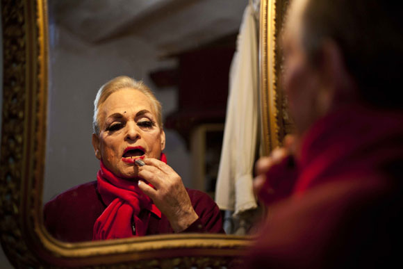 Mi muoverei di più se una vecchietta con cofana e pettinessa spagnola, che mi ricorda la bambola portatami dalla Spagna a 10 anni, non si fosse seduta al mio fianco in tutta la sua imponenza, cacciando un paio di nacchere e fermando ogni artista che tornasse al vicino camerino per segnalare la sua presenza. Una stella d’altri tempi? A un certo punto m’impone di chiedere al cameriere dei tovagliolini di carta, fingendo che siano per me. Le mie vicine, provviste di pinza a fiori “flamenca”, sono in visibilio e non smettono di gridare olé. Io a volte urlo direttamente stabbene!. Mi viene spontaneo, certe mosse e lacrime finte sono proprio da sceneggiata.