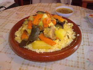 Alle 14.30 (che qui si mangia tardi), il cous cous di cui sopra con un quasi-vicino che ormai è il convitato del venerdì. Un piatto per due, date le dimensioni, basta e avanza. Mettici il laban per me e il mitico succo di banana e avocado che fanno così bene i marocchini (davvero, a imitarlo non ci si riesce), e col tè alla menta finale siamo usciti sazi con 5 euro a testa. Standing ovation alla cuoca, che come sempre mi ha sorriso pacioccona con la faccia incorniciata dal velo.